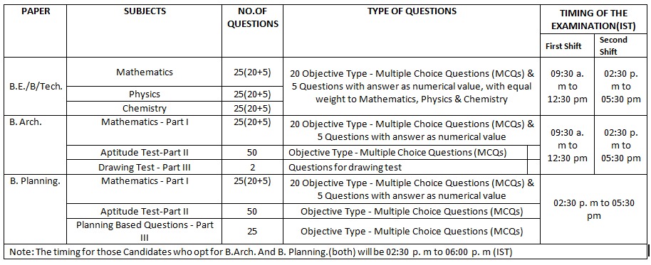 the JEE (Main) will be condudcted twice before admissions in the next academic season. the first JEE (Main) will be held in january whereas the second will be held in April . the students best of the two scores will be considered for preparation of merit list/ Ranking. the examination will be held in Computer Based Test (CBT) mode only , except the questions for drawing test of "B.Arch." which will be held in pen and paper (offline modes).